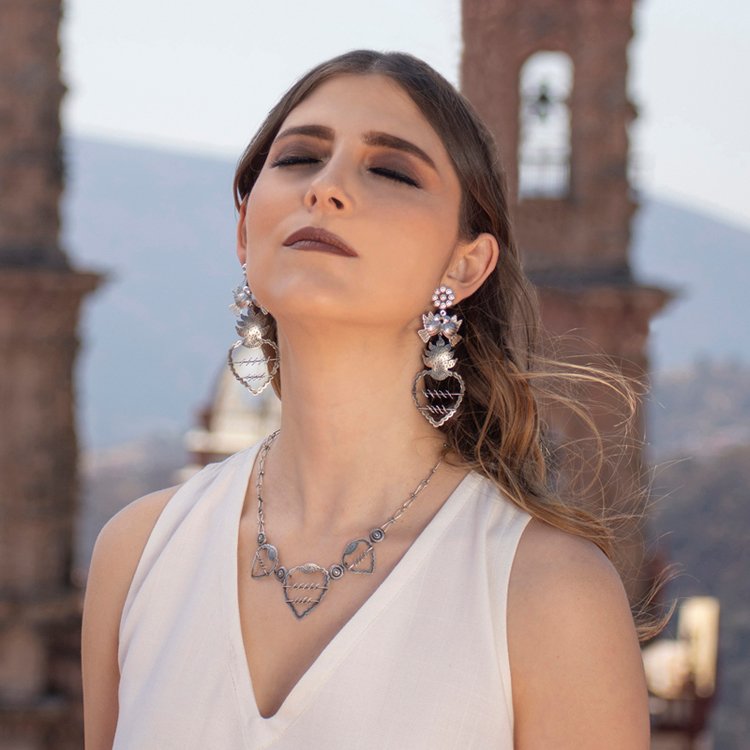 Heart Decree Earrings from the Mexico Heart Collection by María Belén Jewelry, made of .925 Silver, chiseled and openwork technique, matt oxidized finish. Handmade in Mexico, in an artisanal way.